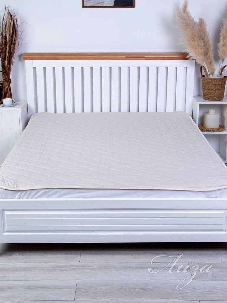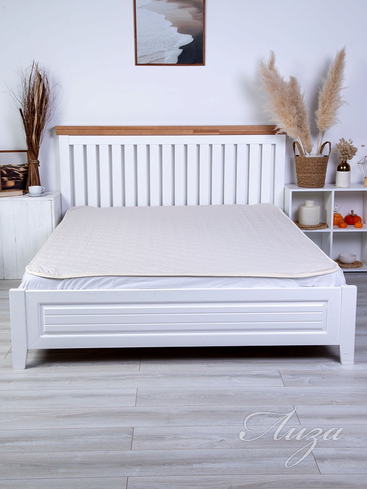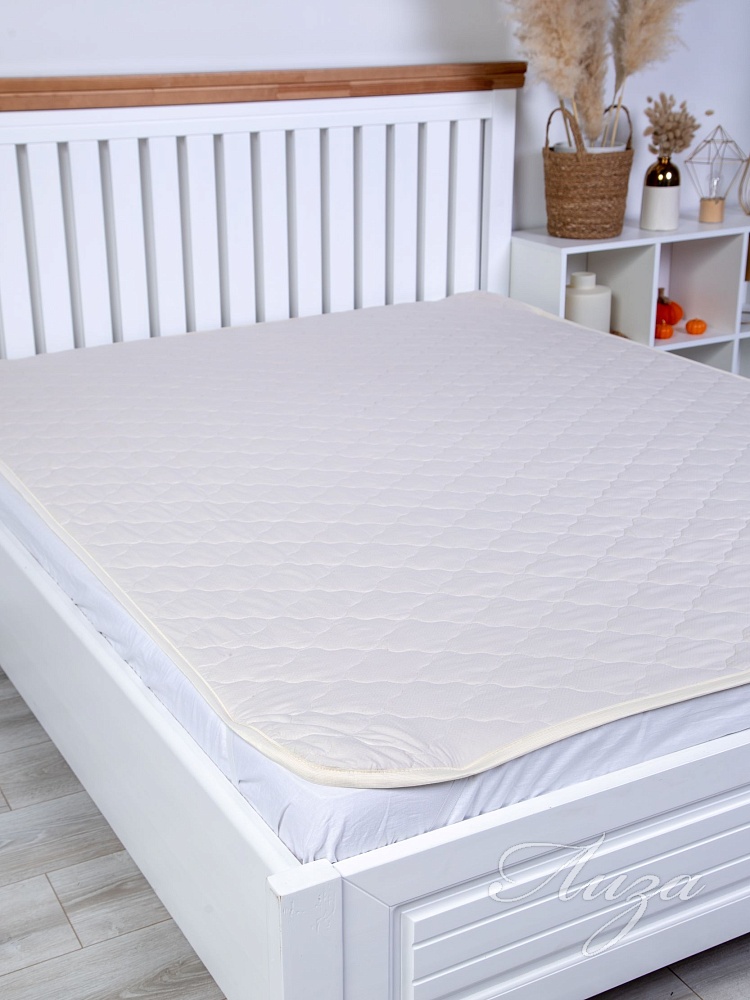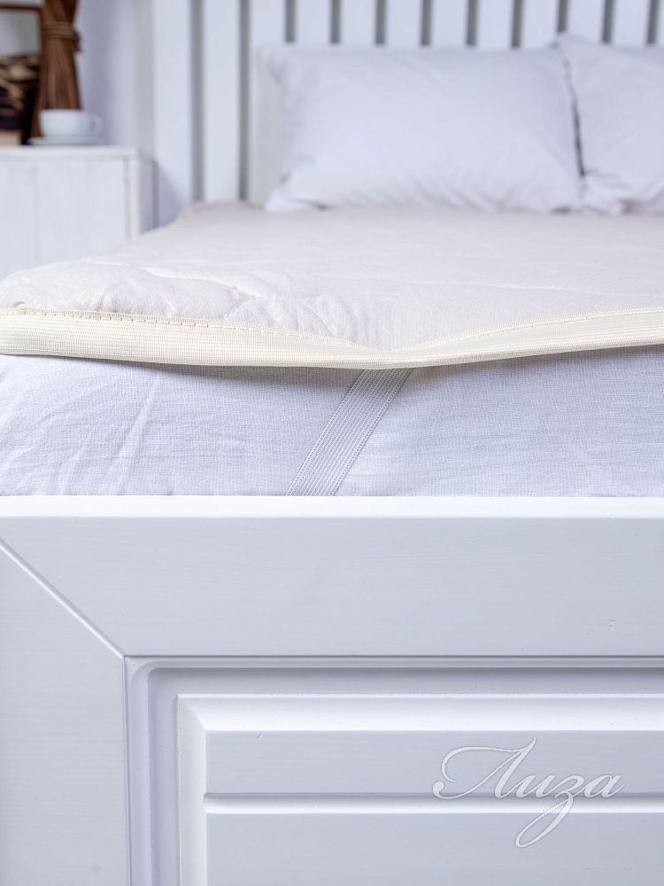 Наматрасник с наполнением из овечьей шерсти плотностью 150 гр/кв.м., окантован широкой тесьмой, по углам - резинка для фиксации на матрасе. Многоигольная стежка исключает смещение наполнителя внутри изделия, чехол устойчив к механическим воздействиям. Упаковка - тубус ПВХ с ручкой.