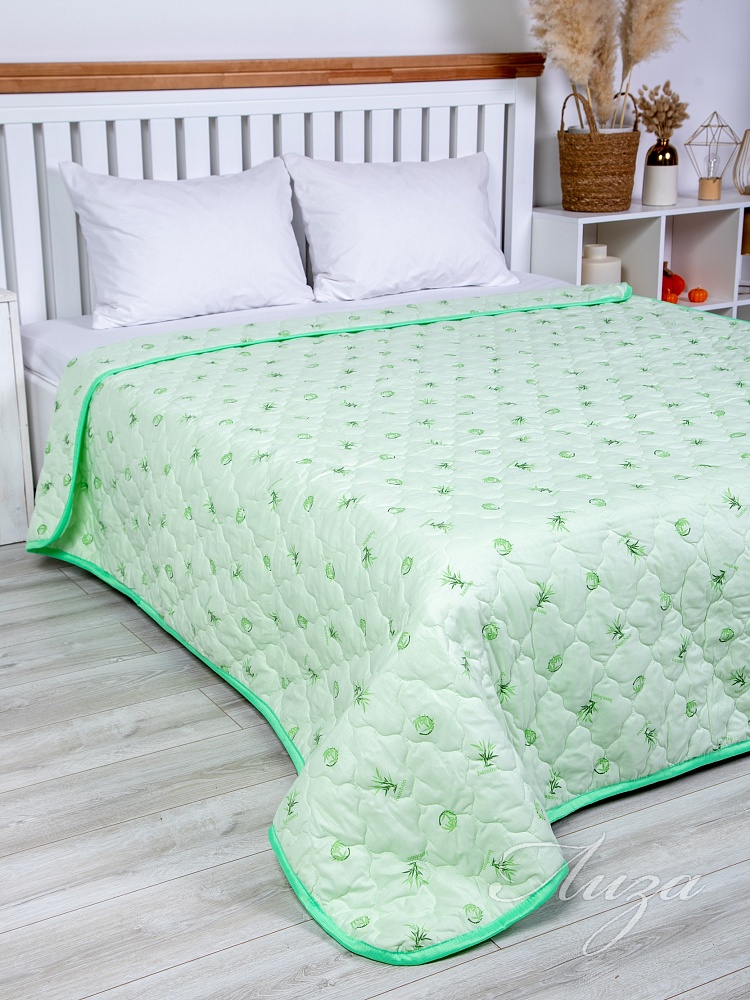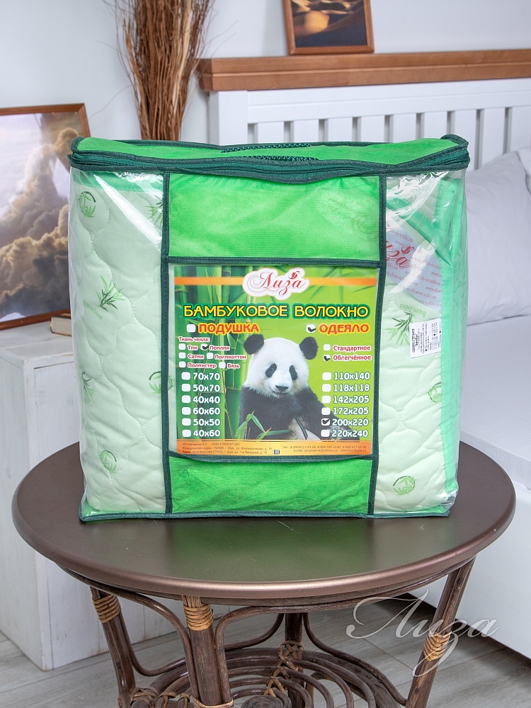 Одеяло-покрывало облегченное Евро-мини с наполнением из термофиксированного бамбукового волокна плотностью 150 гр/кв.м., окантовано широкой тесьмой. Ткань из натурального хлопка отлично пропускает воздух, что способствует регуляции теплообмена во время сна. Упаковка - сумка ПВХ с ручками.