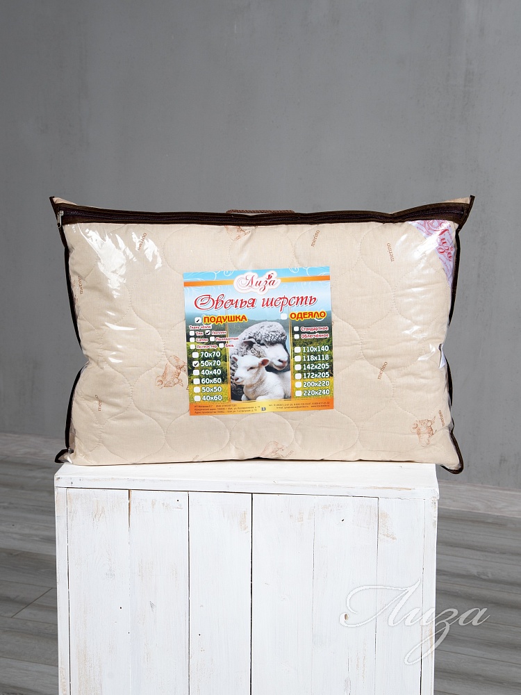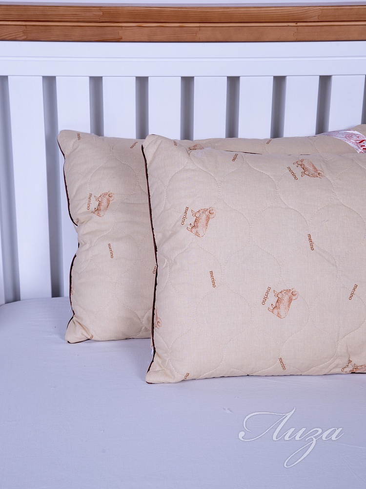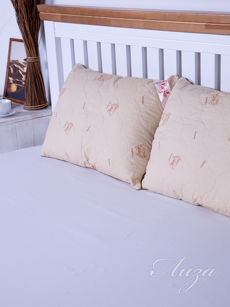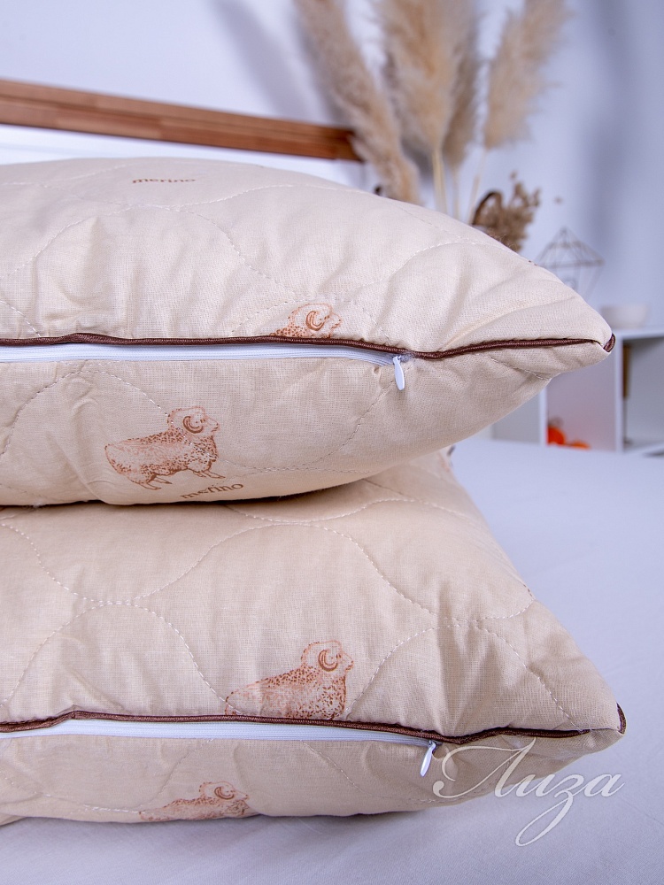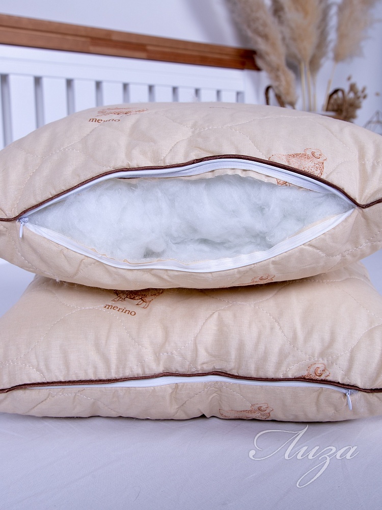 Подушка с содержанием волокон овечьей шерсти. Чехол простеган на многоигольной машине с термофиксированным полотном «Овца» плотностью 100г/кв.м