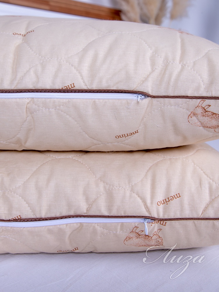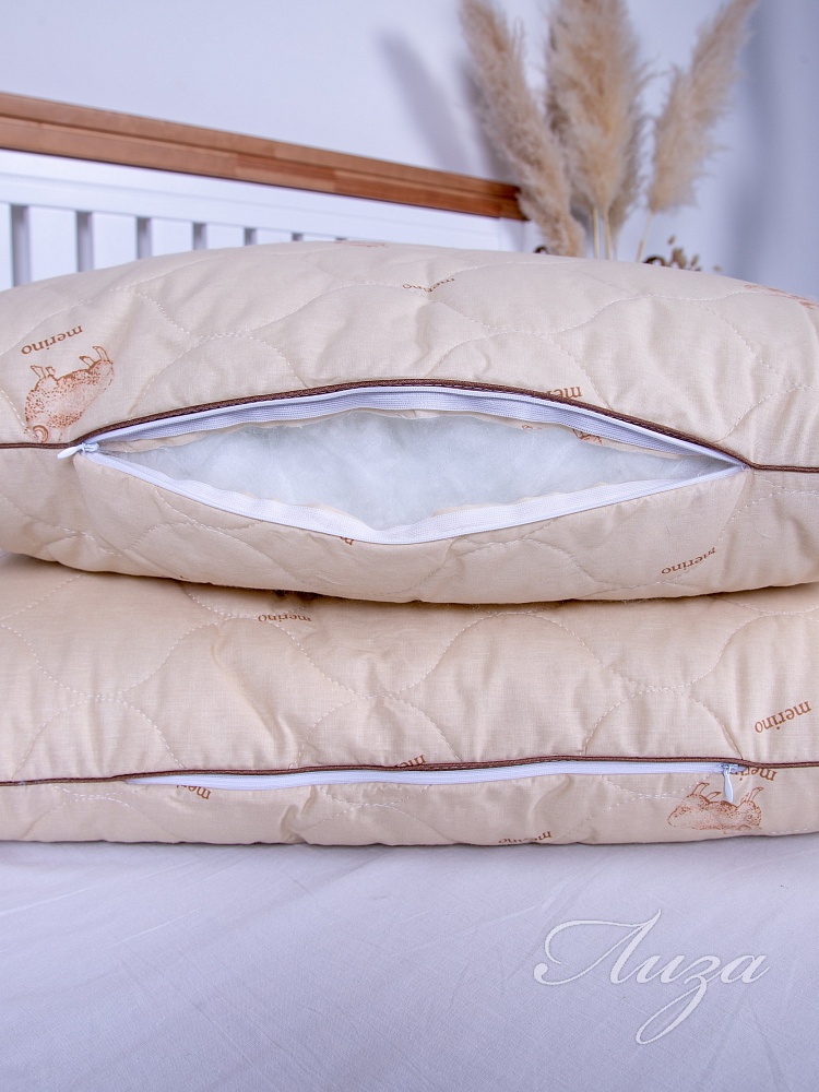 Подушка с содержанием волокон овечьей шерсти. Чехол простеган на многоигольной машине с термофиксированным полотном «Овца» плотностью 100г/кв.м