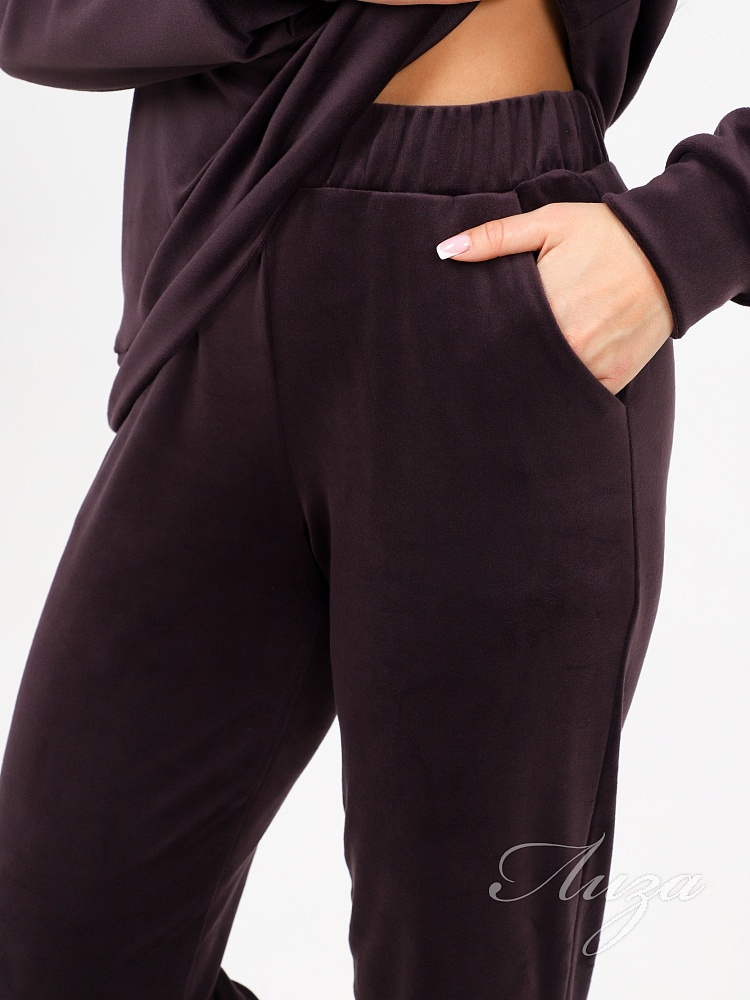 Велюровый костюм - это великолепное сочетание уюта, тепла и стиля, которое идеально подходит для дома. Костюм состоит из худи свободного кроя с длинным рукавом на манжете и брюк прямого кроя с карманами и манжетами внизу.