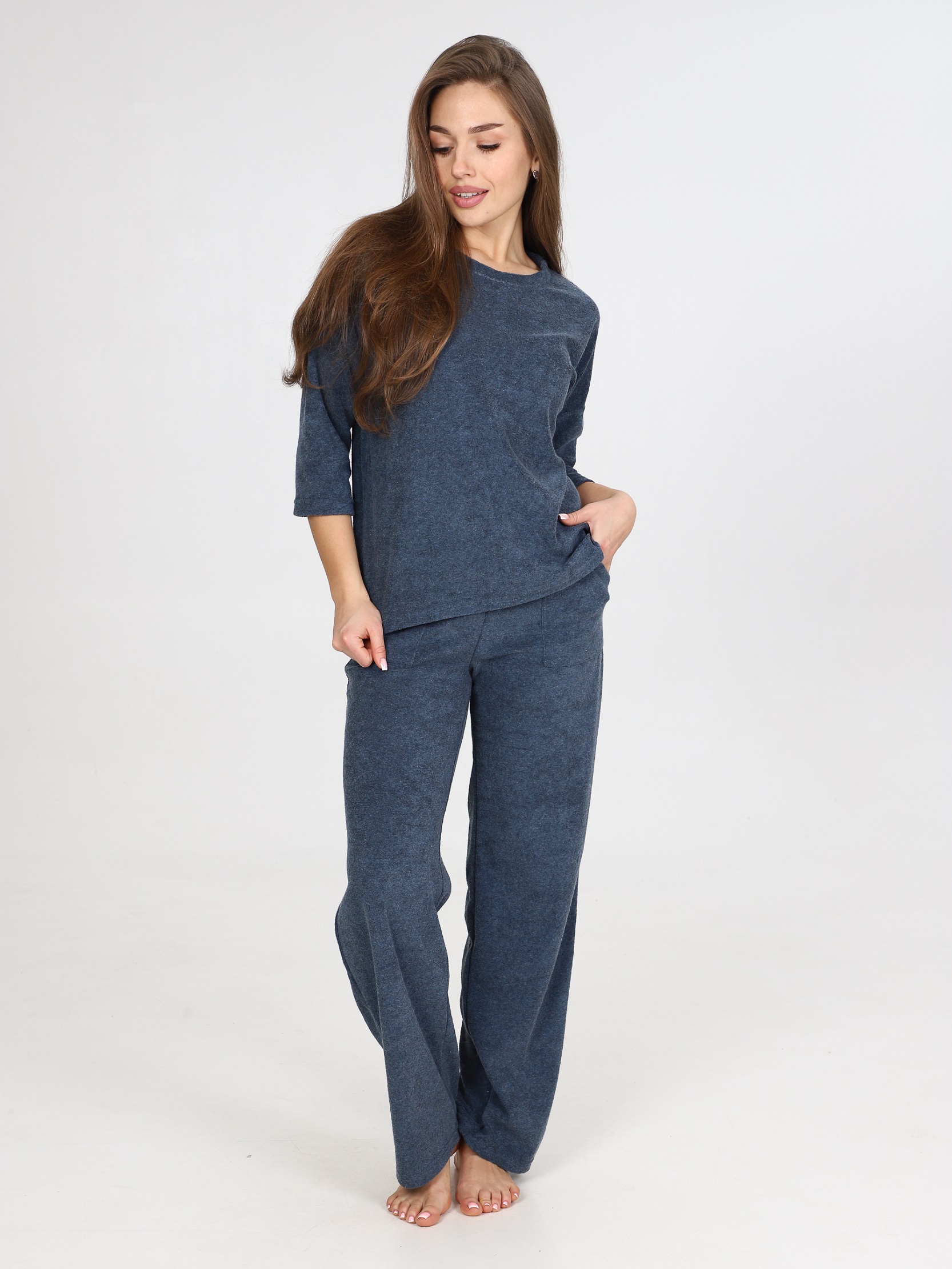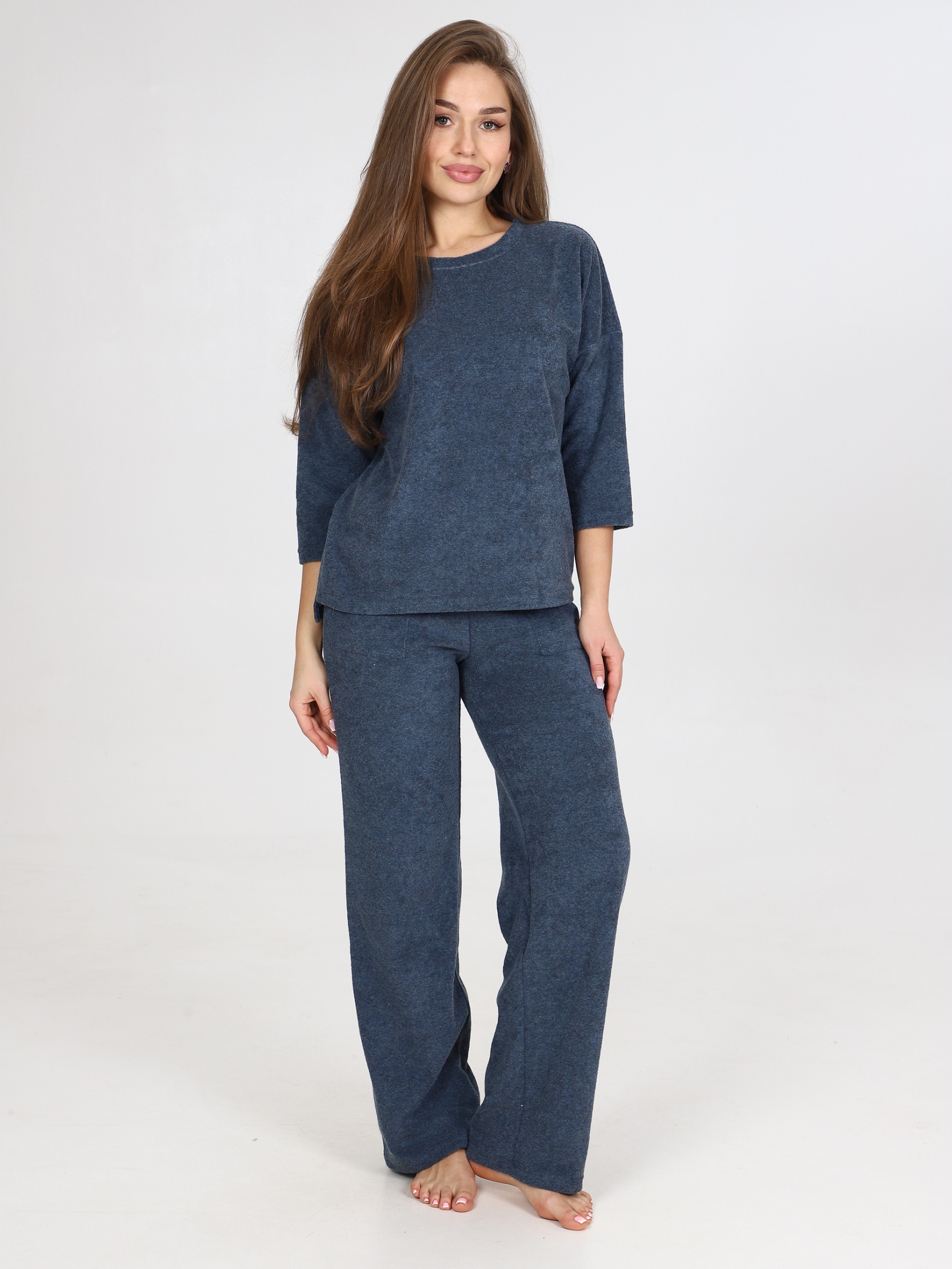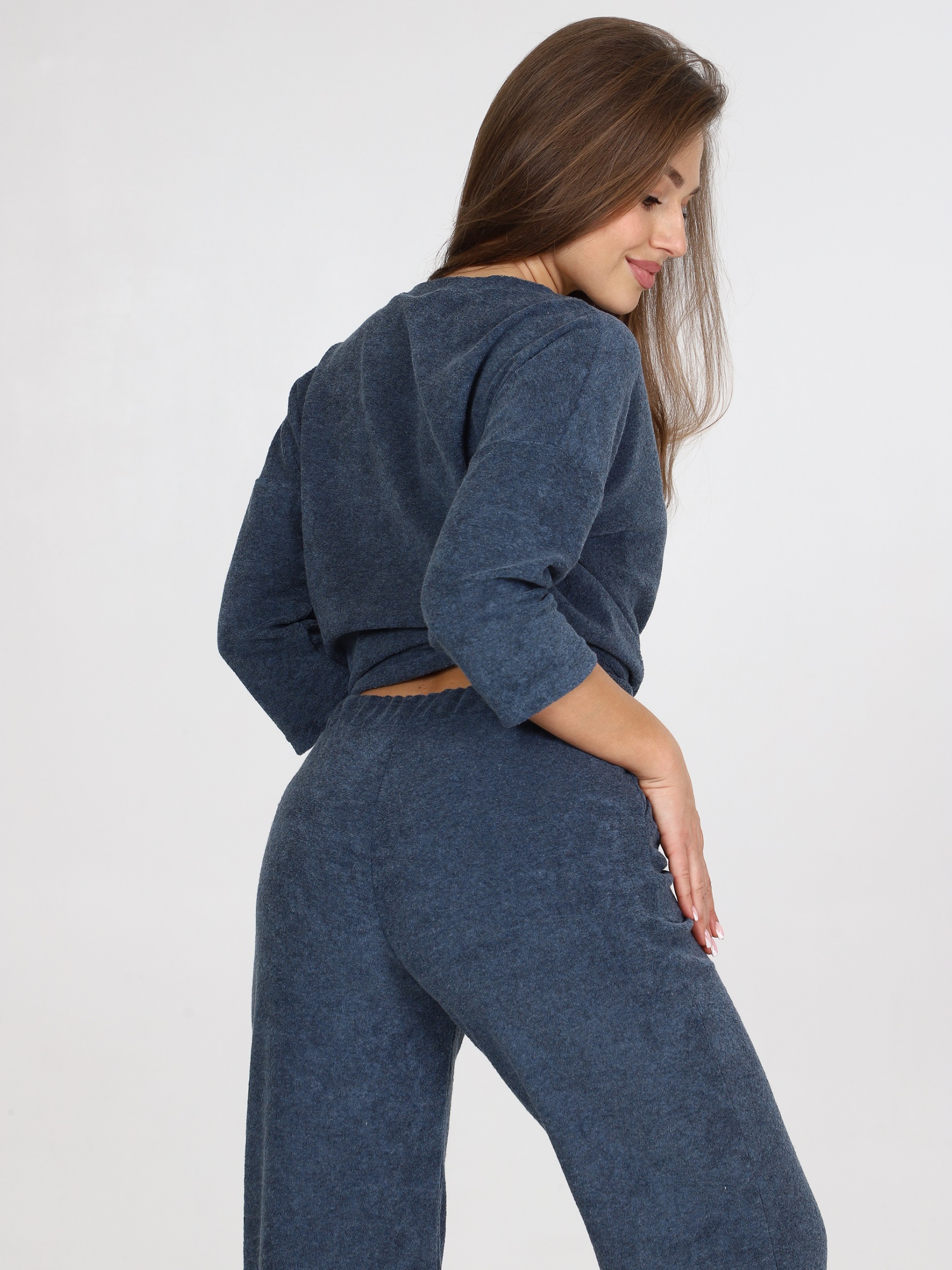 Костюм с кофтой и брюками-палаццо прекрасно подойдет в качестве костюма для дома. Джемпер со спущенным рукавом 3/4 и удлиненной спинкой. Брюки свободного кроя, с карманами. На поясе брюк - контрастная резинка. Костюм из облегчённой махры – это идеальный вариант для тех, кто ищет комфорт и стиль в одежде. Облегчённая махра является очень мягкой и приятной на ощупь, что делает этот костюм идеальным для домашнего отдыха. Изделия из этой ткани отлично сохраняет тепло, при этом обеспечивая отличную циркуляцию воздуха, что делает его подходящим для носки как в холодные, так и в тёплые дни. Одежда из облегченной махры легко стирается и гладится, не теряет форму. Костюм из облегчённой махры станет вашим надёжным спутником в повседневной жизни, предоставляя вам комфорт и удобство.