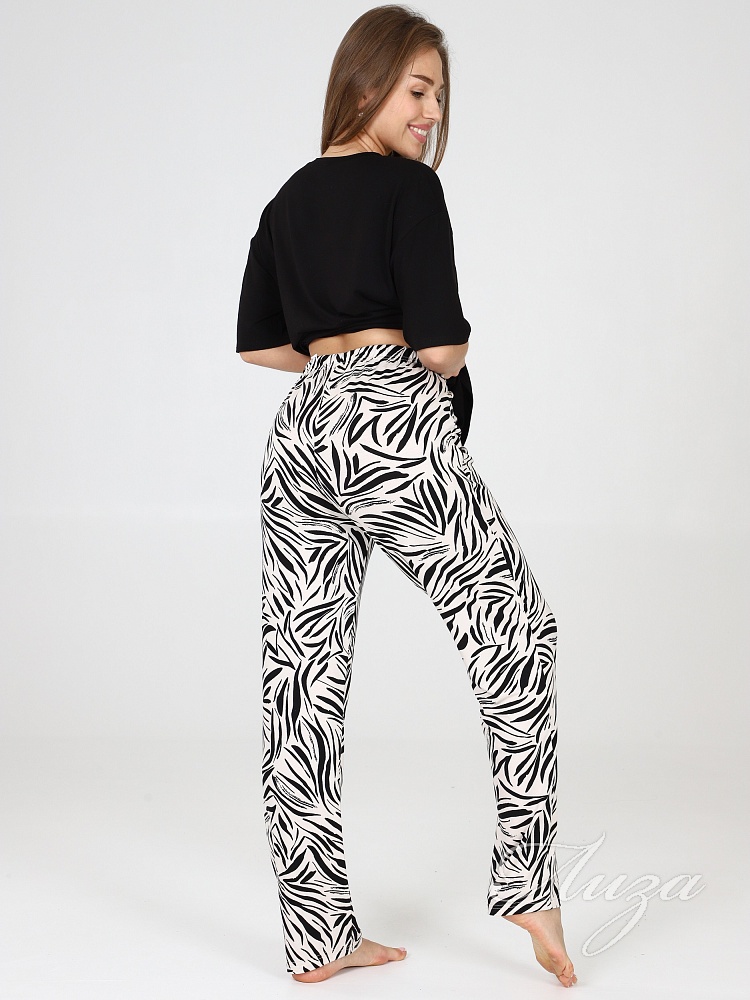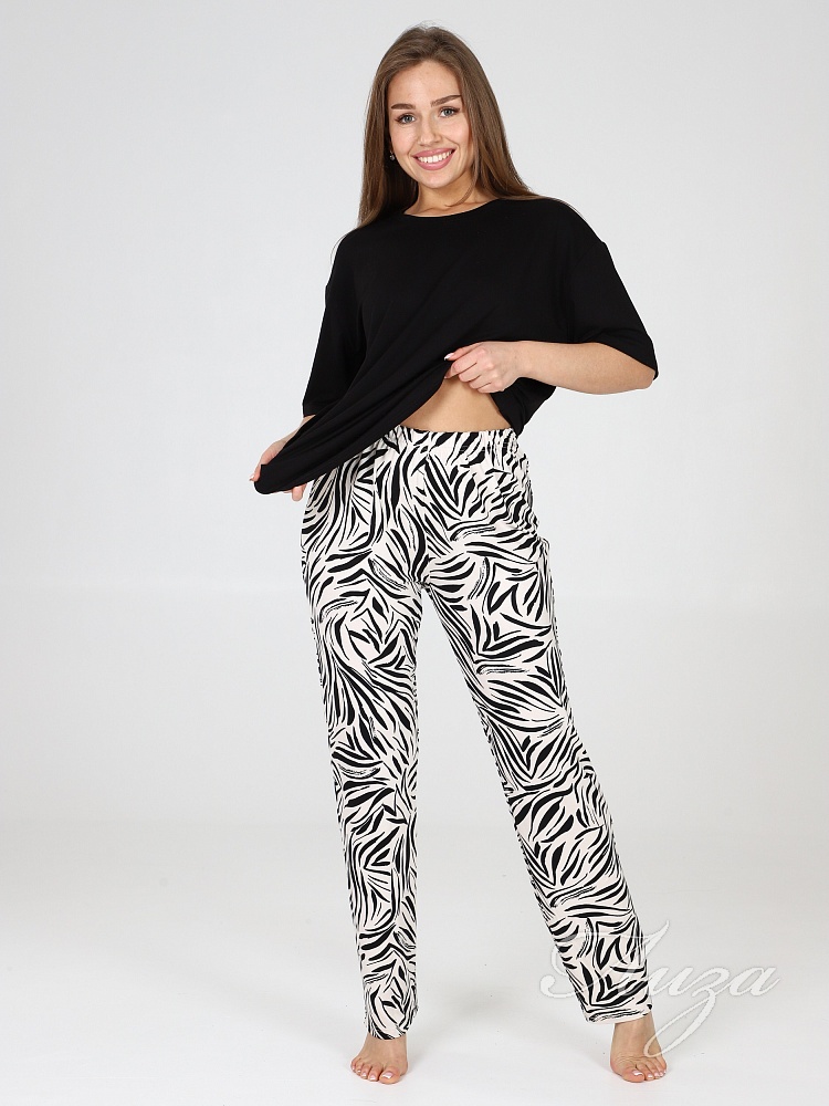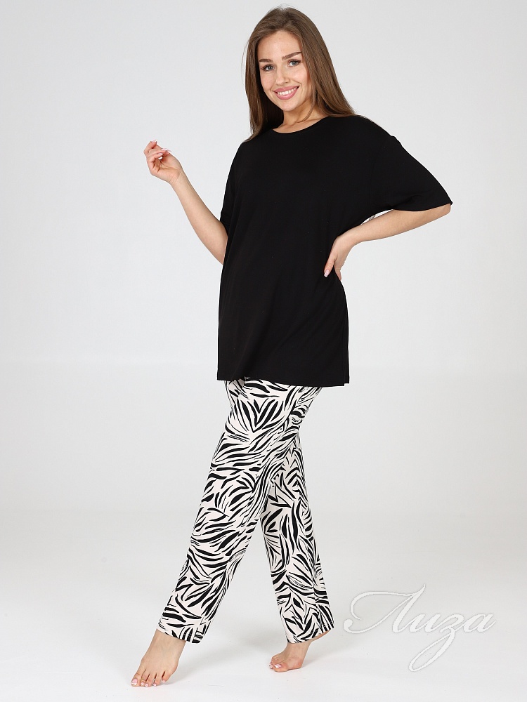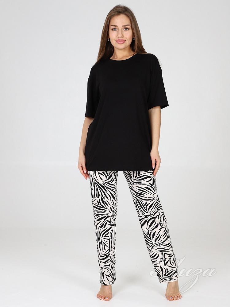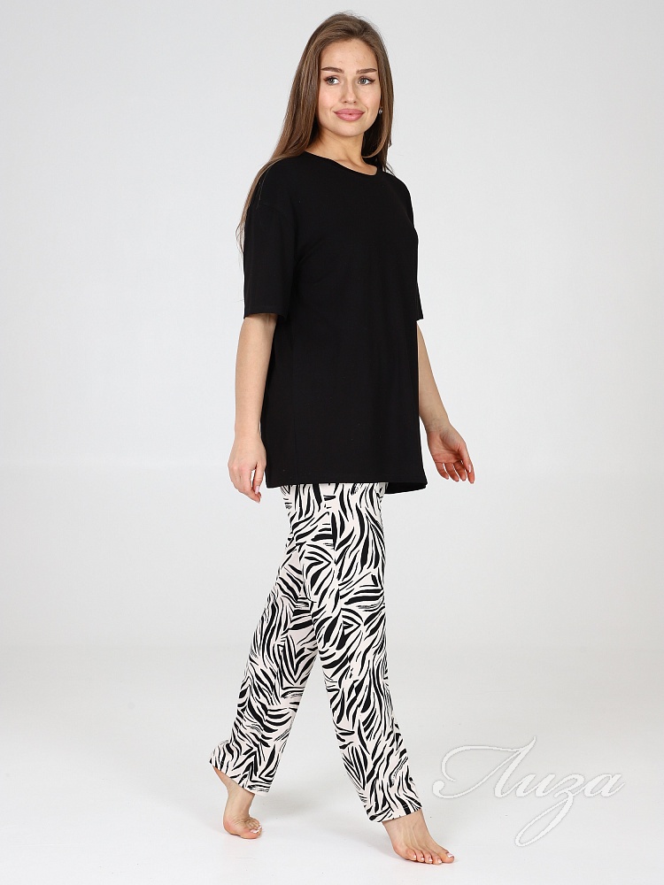 Костюм для женщин состоит из удлиненной футболки в стиле oversize и брюк. Модная свободной формы футболка со спущенным рукавом и прямые брюки с посадкой по талии будут незаменимыми вещами в путешествии , а также заменят пижаму и домашнюю одежду на даче.
