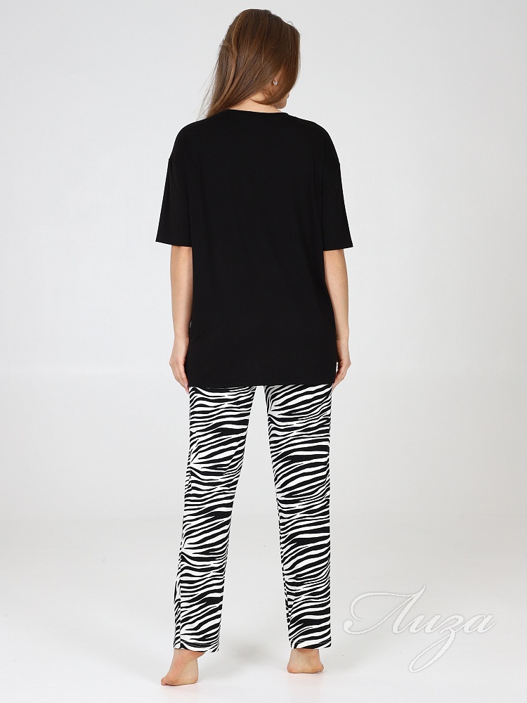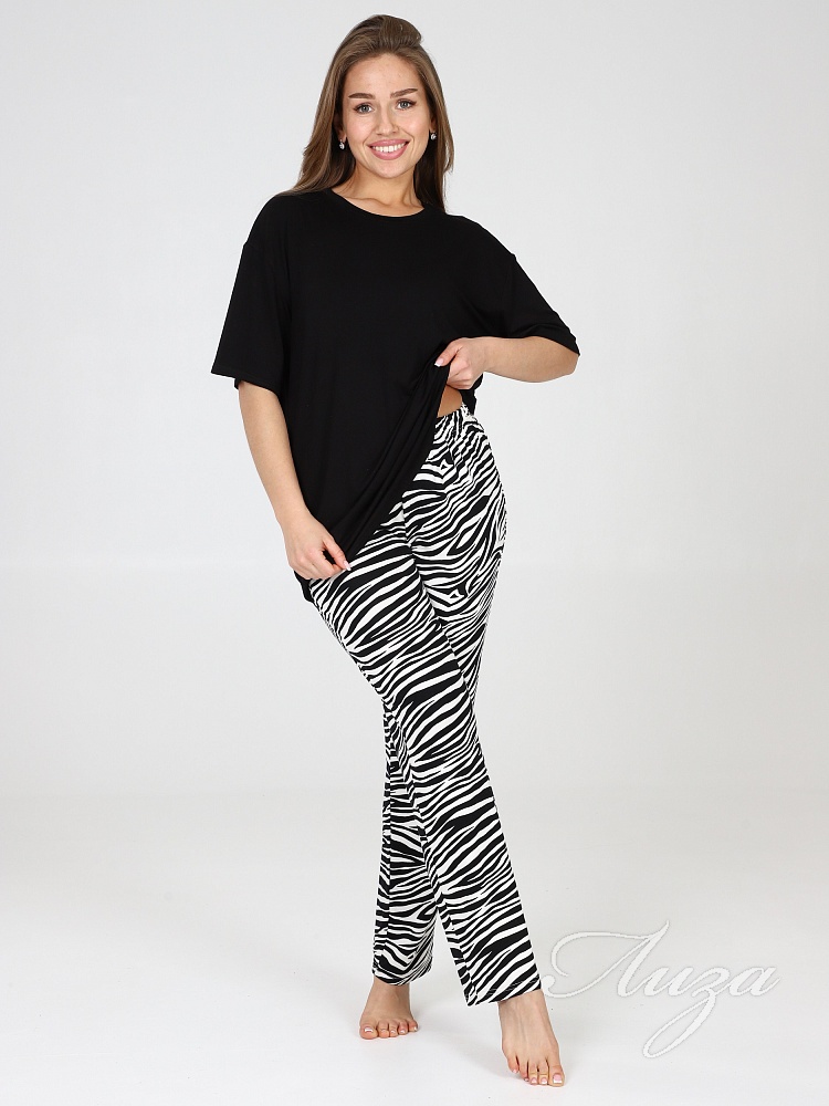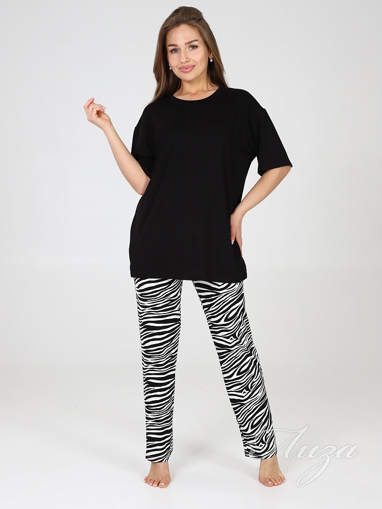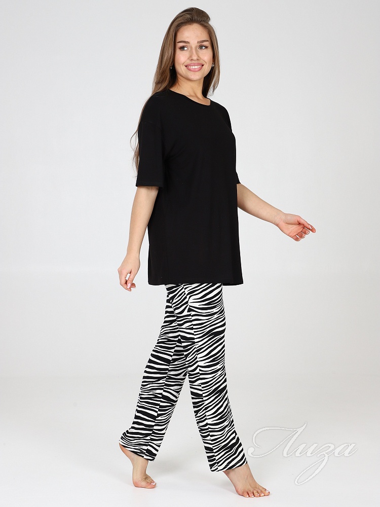 Костюм для женщин состоит из удлиненной футболки в стиле oversize и брюк. Модная свободной формы футболка со спущенным рукавом и прямые брюки с посадкой по талии будут незаменимыми вещами в путешествии , а также заменят пижаму и домашнюю одежду на даче.