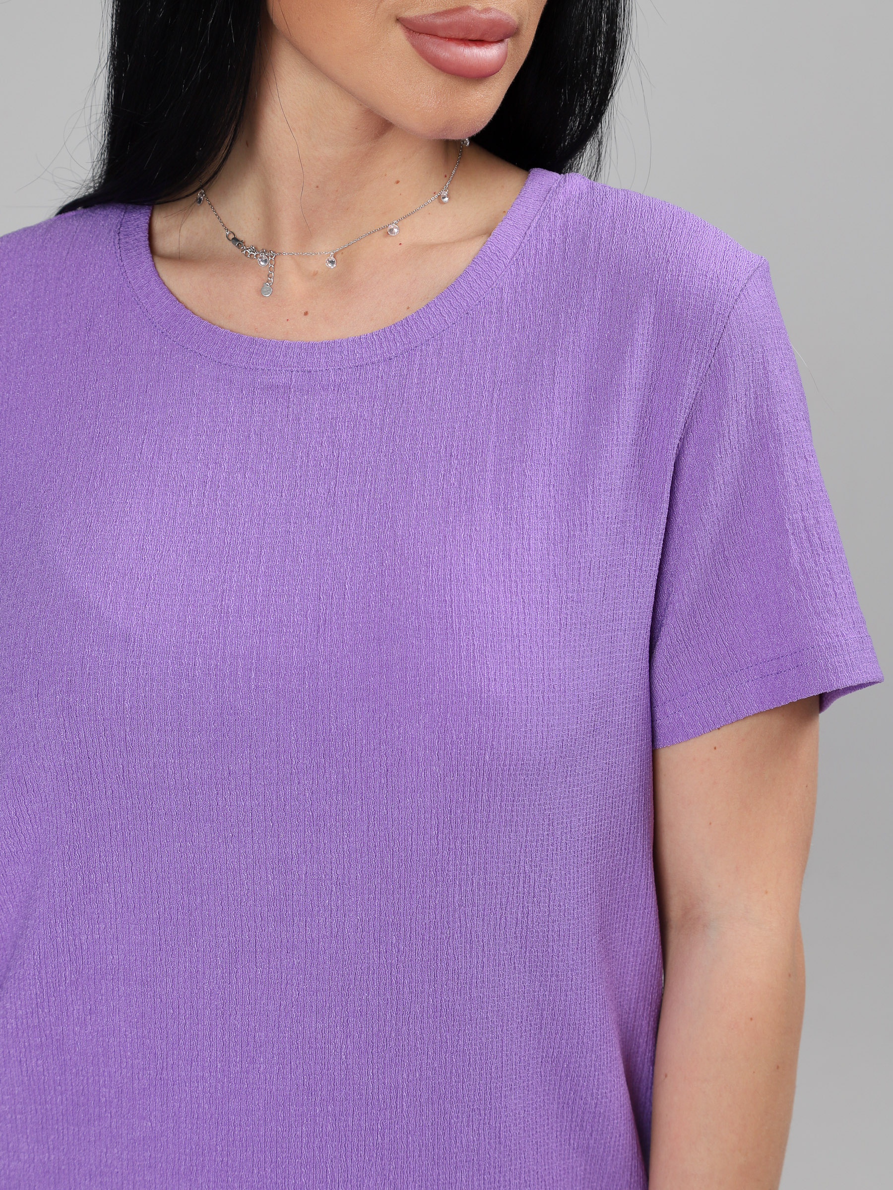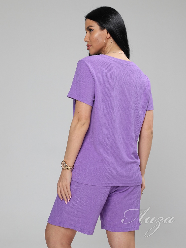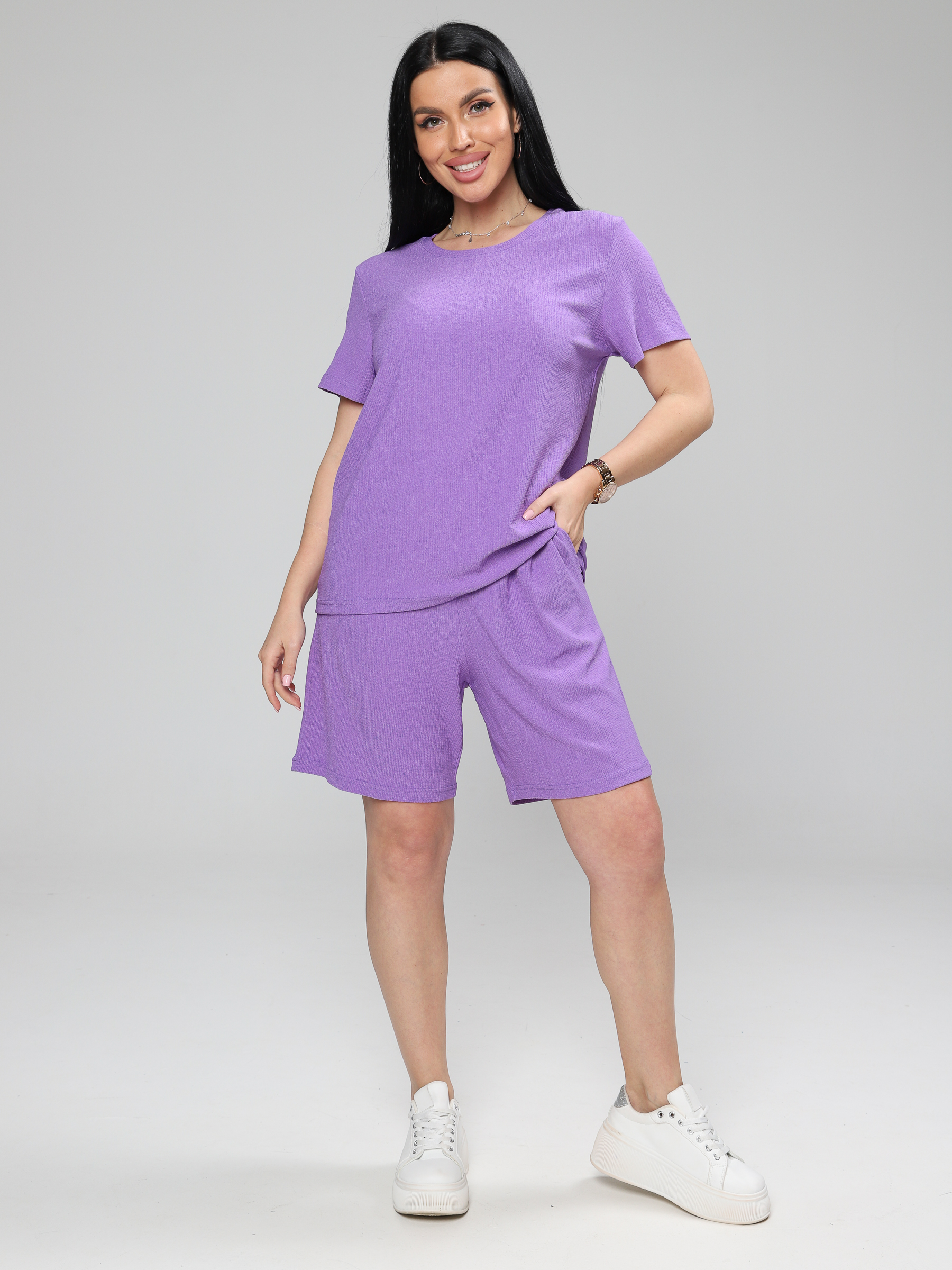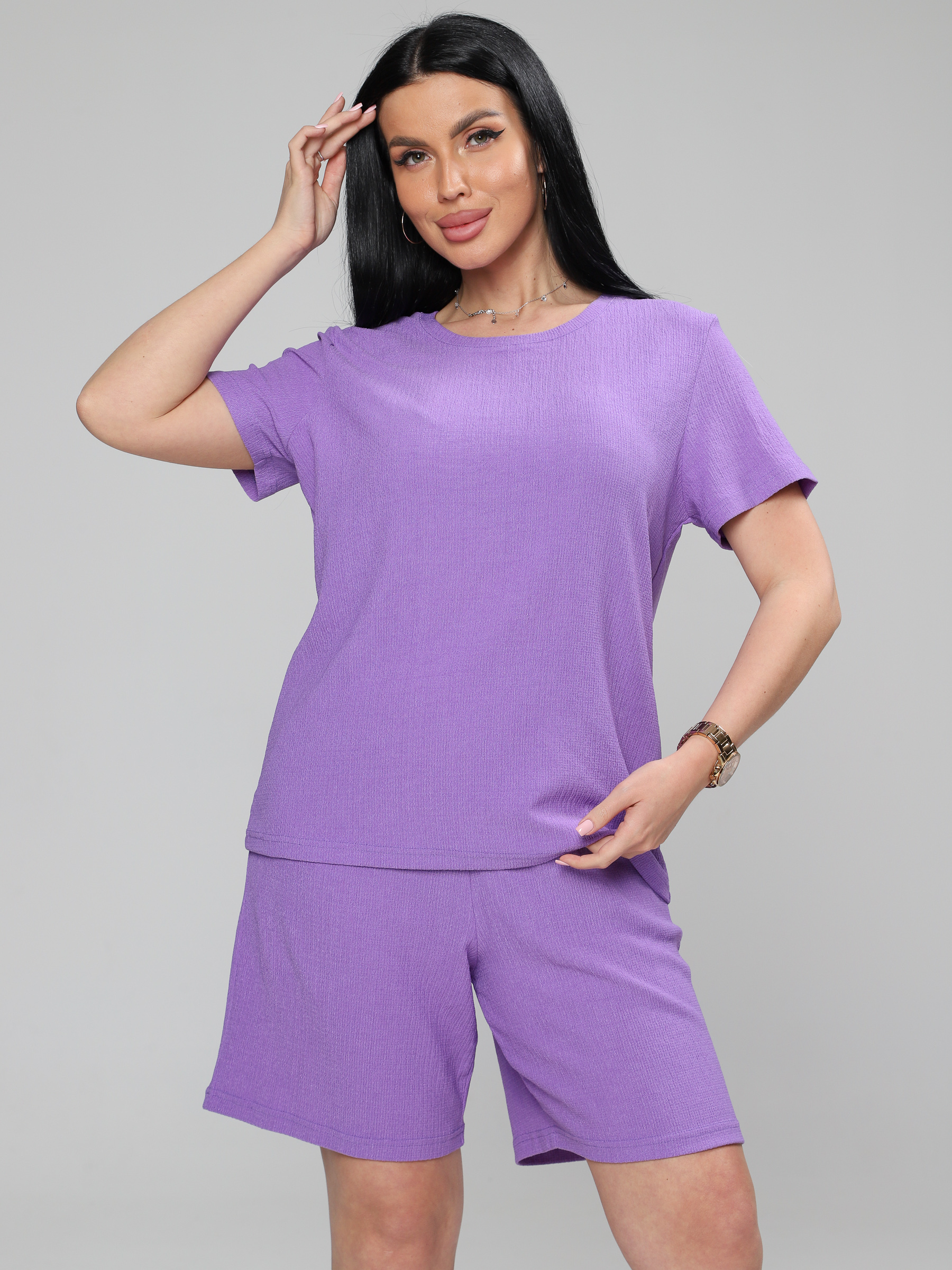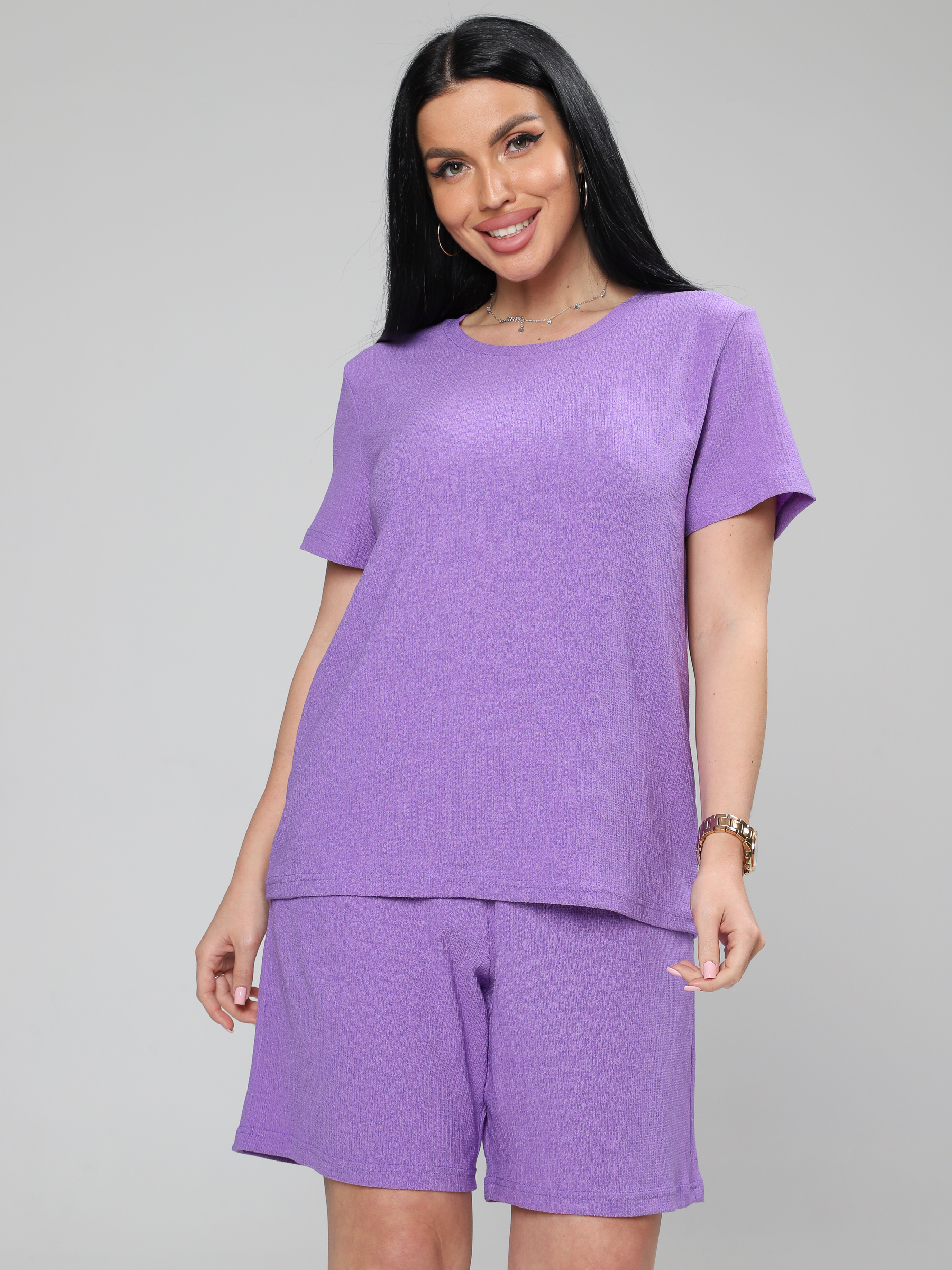 Женский костюм из жатки– отличный выбор для комфортного и стильного летнего образа. Летний, легкий костюм состоит из футболки и шорт с удобной посадкой и резинкой на поясе.