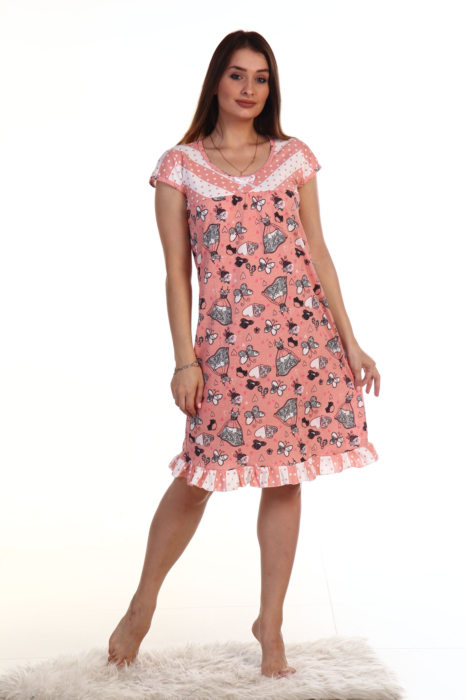 Предлагаем купить трикотажную ночную сорочку с коротким рукавом-”фонарик” на кокетке. Укороченная модель с подрезом над грудью, по подолу украшена кружевом. Изделие сшито из натуральной хлопковой ткани. Основная расцветка - коралл.