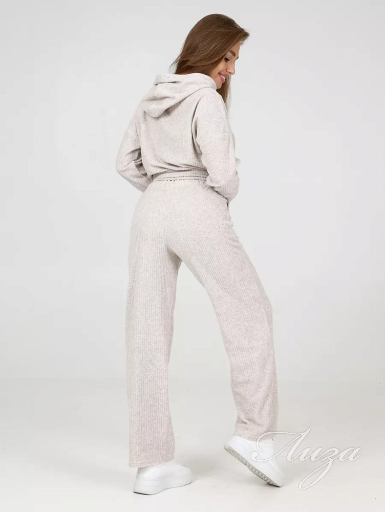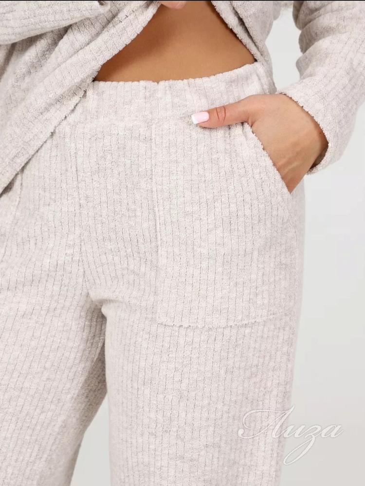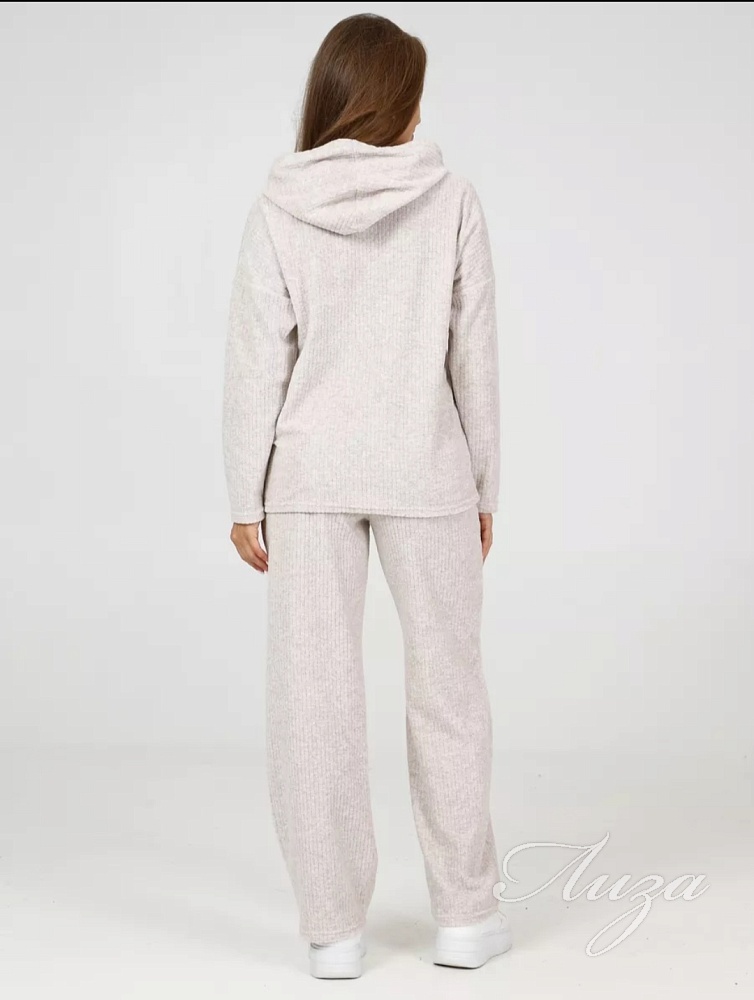 Махровый костюм в рубчик - это великолепное сочетание уюта, тепла и стиля, которое идеально подходит для дома. Костюм состоит из худи свободного кроя с длинным рукавом со спущенным плечом и брюк прямого кроя с карманами.