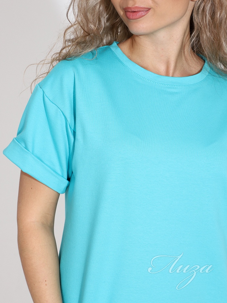Футболка oversize с круглым вырезом горловины. Рукав короткий, со спущенным плечом. На рукавах выполнены отвороты.