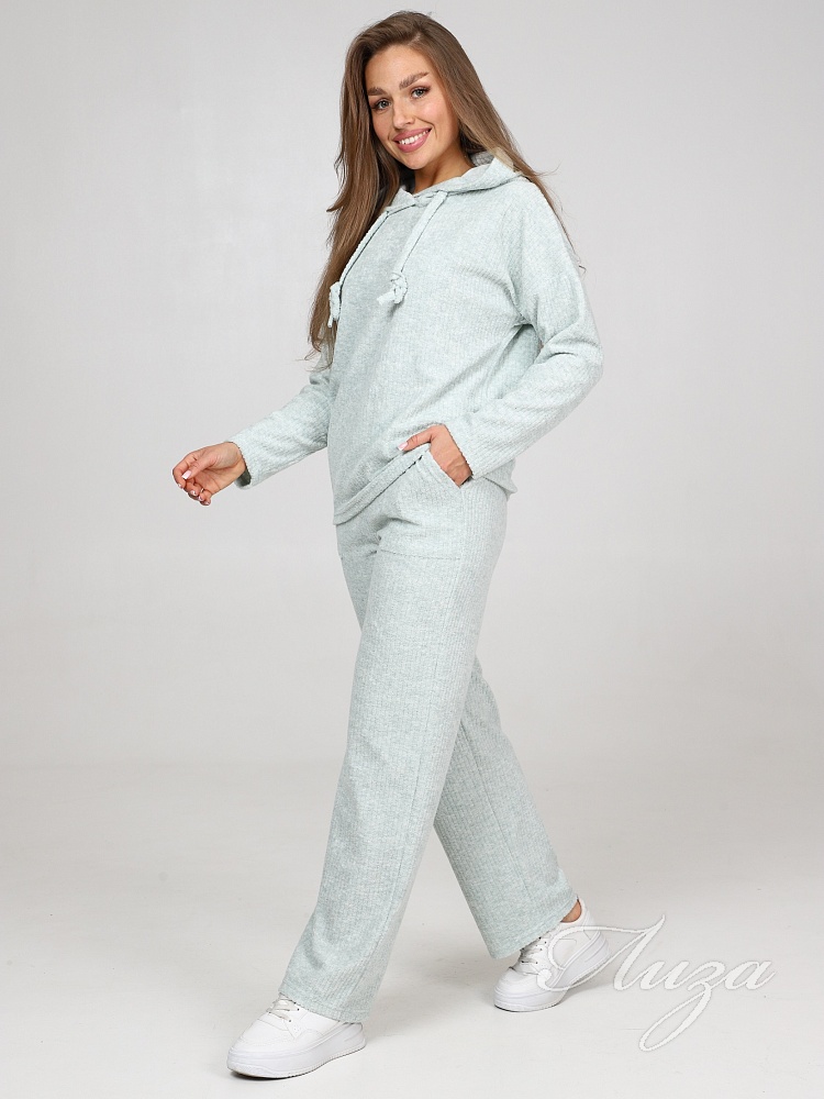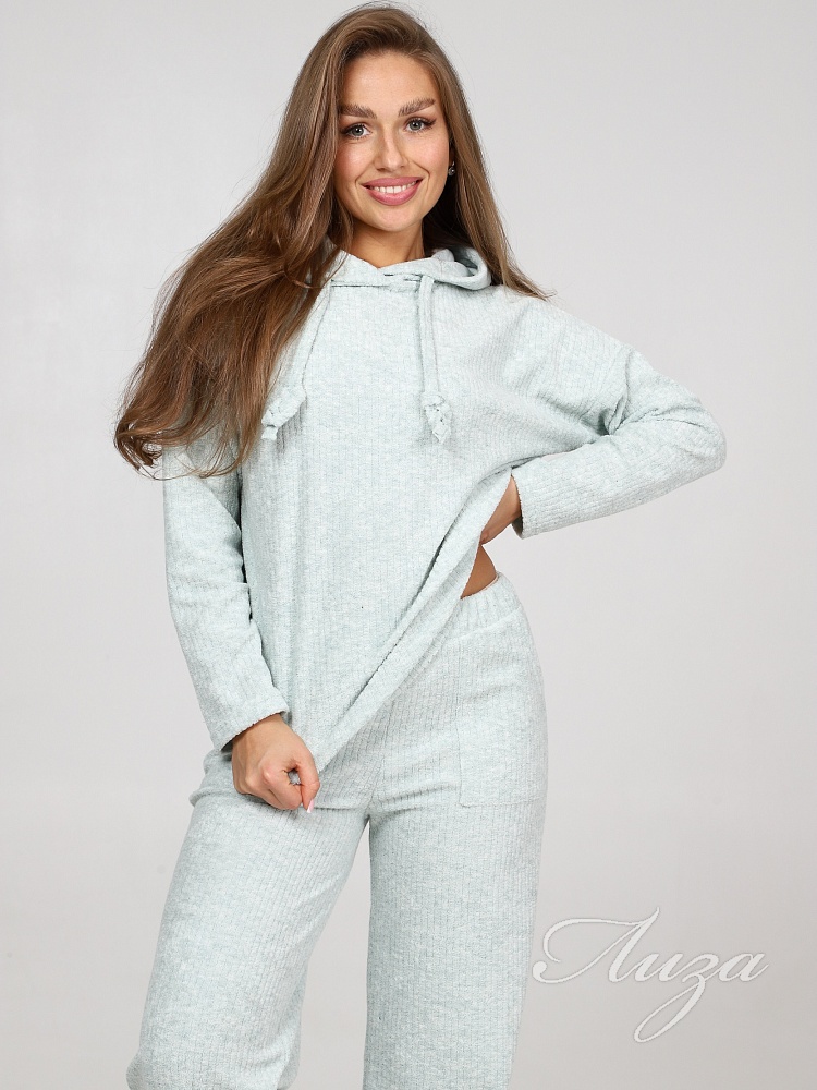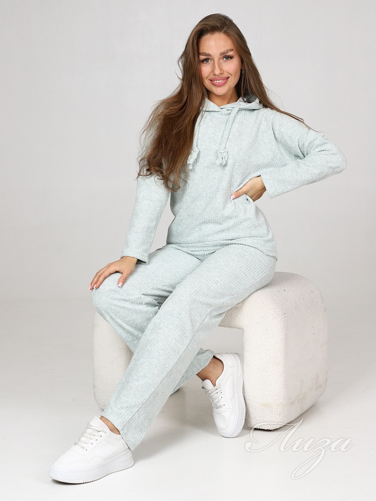Махровый костюм в рубчик - это великолепное сочетание уюта, тепла и стиля, которое идеально подходит для дома. Костюм состоит из худи свободного кроя с длинным рукавом со спущенным плечом и брюк прямого кроя с карманами.