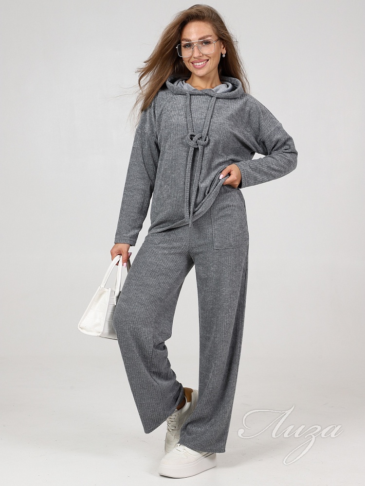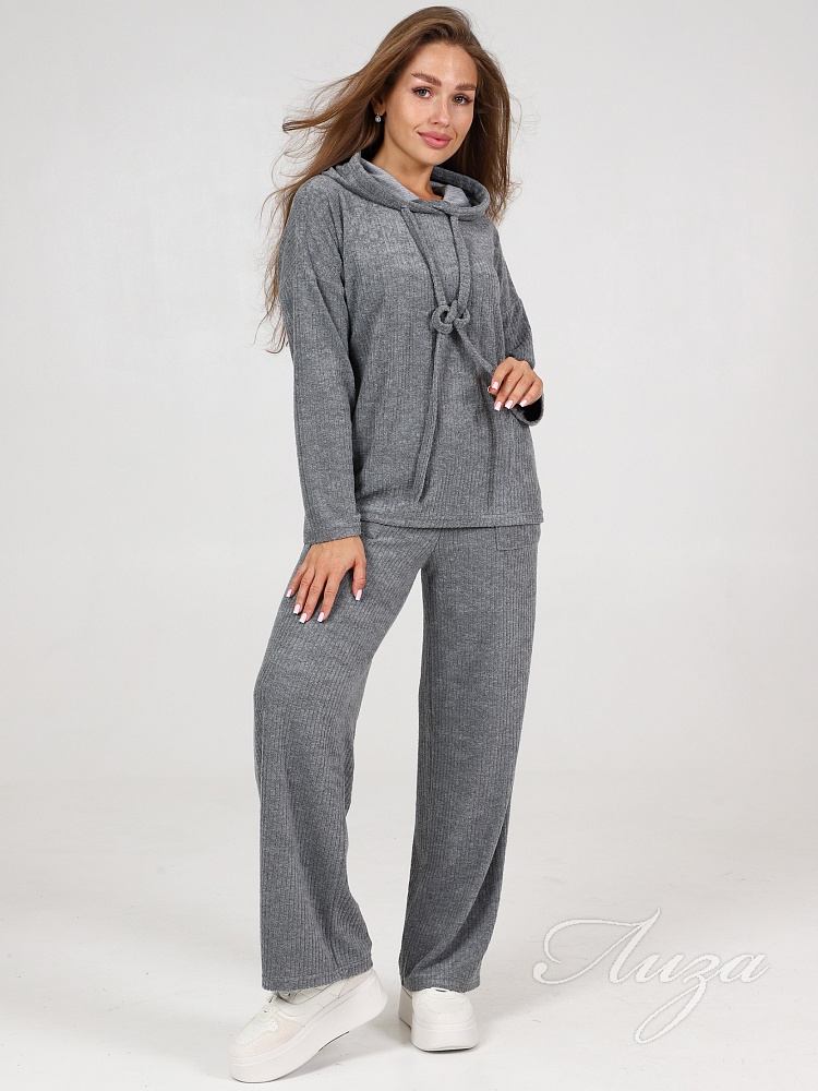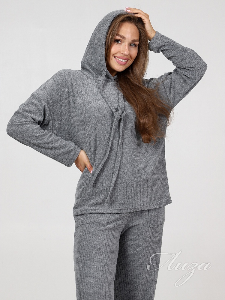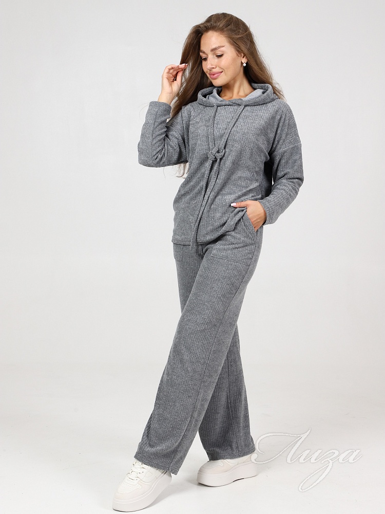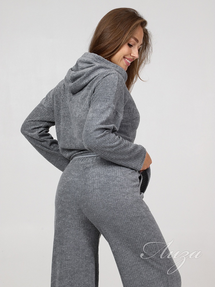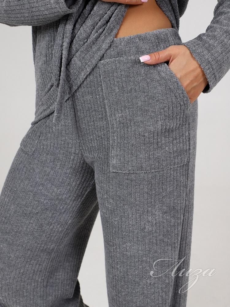 Махровый костюм в рубчик - это великолепное сочетание уюта, тепла и стиля, которое идеально подходит для дома. Костюм состоит из худи свободного кроя с длинным рукавом со спущенным плечом и брюк прямого кроя с карманами.
