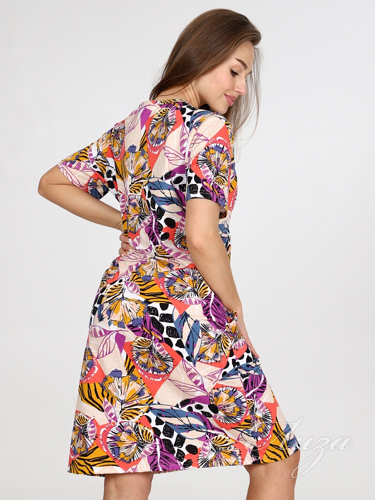 Домашнее платье полуприлегающего силуэта длиной до колена. Рукав короткий. Изделие имеет два боковых кармана.